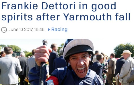 A distanza di quasi 24 ore, diamo conto dell’aggiornamento della situazione circa l’infortunio occorso a Frankie Dettori in seguito alla caduta del jockey italiano ieri pomeriggio prima della prima corsa del convegno di Yarmouth. Frankie è caduto mentre era in procinto di salire su un debuttante che si chiama Tivoli, il quale si è “mosso” proprio mentre il nostro eroe stava per salire con il risultato di essere sbalzato dall’altra parte della sella.